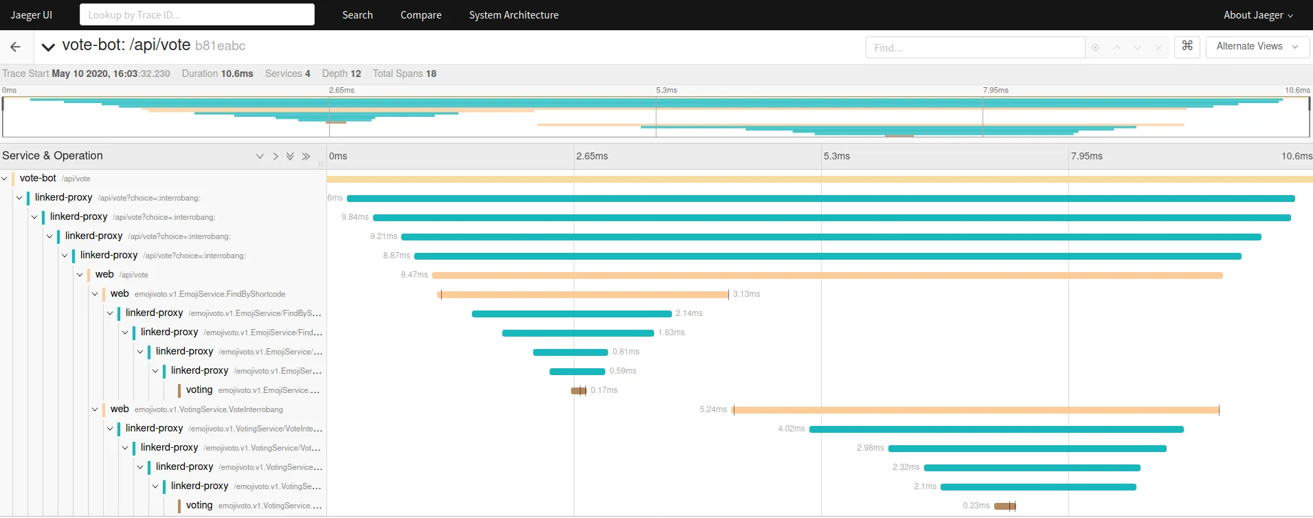So, As you can see there are spans of the linkerd-proxy. For each request between two meshed components, you can see there are four linkerd-proxy spans.